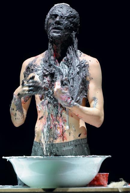 W finale przywołanej już Orestei performatywnemu działaniu Sebastiana Pawlaka (Orestes) towarzyszył filmowy zapis analogicznych działań. Widzowie obserwowali aktora ustawionego na proscenium dużej sceny, który kilkakrotnie powtarzał tę samą sekwencję. Oklejał swoją twarz i szyję ciągliwą, ziemistą substancją, a farbą podkreślał czerń oczu i czerwień ust, po czym pobieżnie wycierał twarz i „malowanie” rozpoczynał od nowa. Działaniu towarzyszył przygotowany wcześniej zapis filmowy niemal identycznych działań, emitowany z delikatnym wyprzedzeniem poszczególnych faz na ogromnym ekranie. Zestawienie wątłego ciała aktora i jego trudno dostrzegalnych (przynajmniej przez widzów z dalszych rzędów) czynności z dużym, bogatym w detale, łatwo dostępnym i dominującym nad sceną obrazem ogromnego popiersia wprowadzało rozbicie percepcji publiczności. Niewielka żywa twarz aktora nikła w przestrzeni. Natomiast olbrzymi obraz zniekształconego mazią oblicza, wywołującego u obserwujących widzów nieprzyjemne wrażenia „dotyku wyobrażonego”, atakował wzrok publiczności, jakby domagając się ich reakcji. Dodatkowo przesunięcie o kilkanaście sekund poszczególnych faz – obrazy wyprzedzały działania na scenie – wprowadzało efekt zapętlenia, wzmagało poczucie niekończącej się powtarzalności upiornej transformacji.