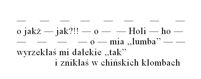 Oto kolejny przykład funkcjonalizacji współdziałających zabiegów typograficznych i fonostylistycznych – służących tym razem jako środki dialogu z poetyką Młodej Polski (Śniecikowska 2008: 89-150):