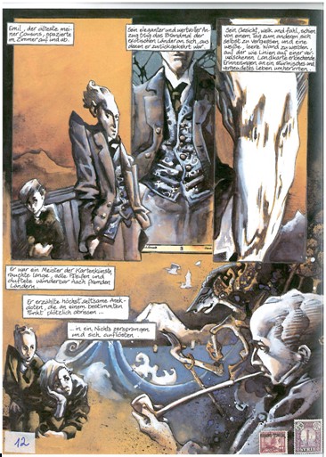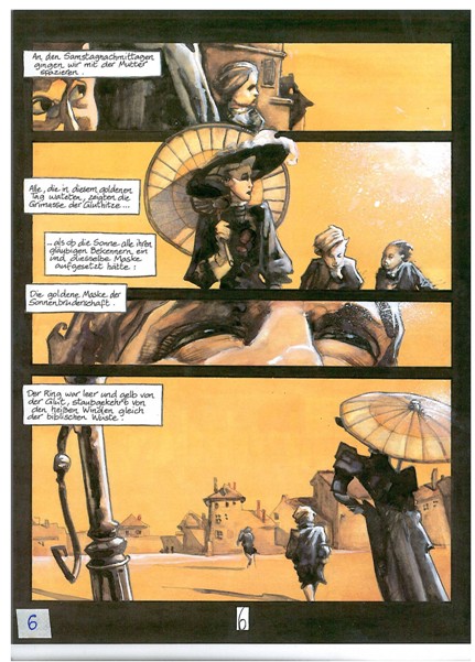Niezbędną w komiksie spójność obrazów osiąga Jüdt za sprawą ukształtowania przestrzeni. Punkt widzenia stale się zmienia, poszczególne rysunki sprawiają wrażenie kadrów filmowych; ujęcia z perspektywy żabiej przeplatają się z detalami: ręką, oczami, przerażoną twarzą: