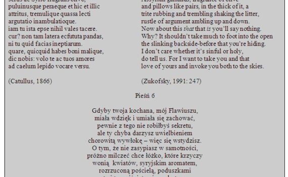 Audialna dominanta przekładu oznacza prymat takiego czynnika konstrukcyjnego, który apeluje do zmysłu słuchu odbiorcy, potęgując także kinestetyczne doznania ruchu narządów mowy recytatora. Audialny chwyt artystyczny (wzorzec rytmiczny lub instrumentacja głoskowa: harmonia wokaliczna, eufonia, aliteracja, paronomazja, tautacyzm, zabiegi wykorzystujące synestezyjne możliwości toku akcentowego, instrumentacyjna funkcja rymów) funkcjonalnie podporządkowuje i deformuje wszystkie […]
