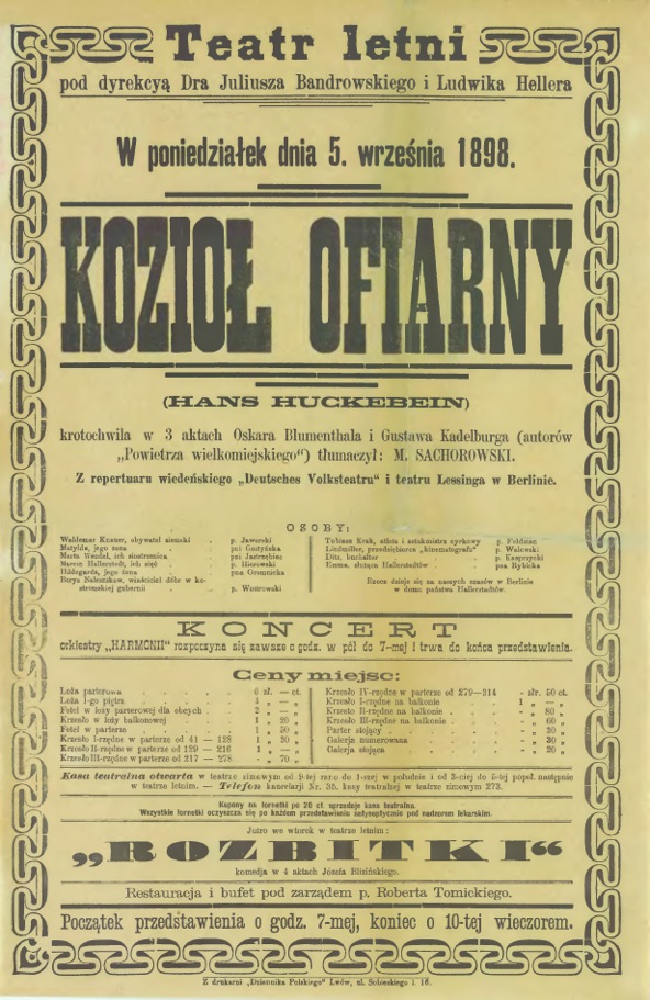 Afisz teatralny z przedstawienia „Kozioł Ofiarny” w Teatrze Letnim we Lwowie (5 IX 1898)