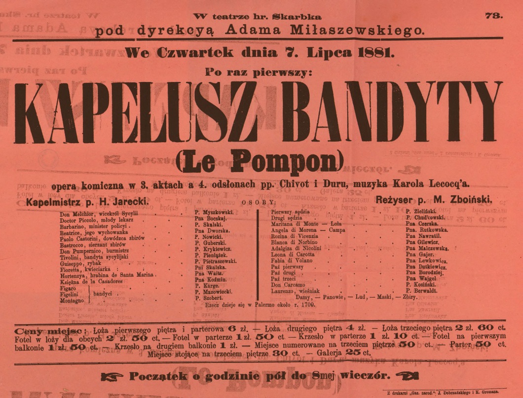 Afisz teatralny z przedstawienia „Kapelusz bandyty” w Teatrze Hr. Skarbka we Lwowie (7 VII 1881)