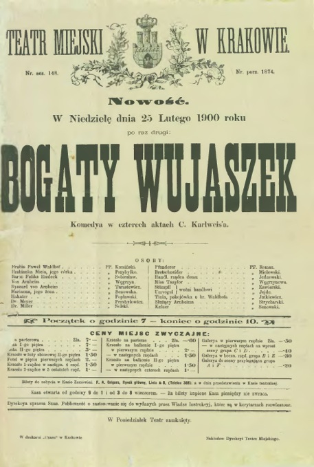 Afisz nr 1874 z przedstawienia „Bogaty Wujaszek” w Teatrze Miejskim w Krakowie (25 II 1900)