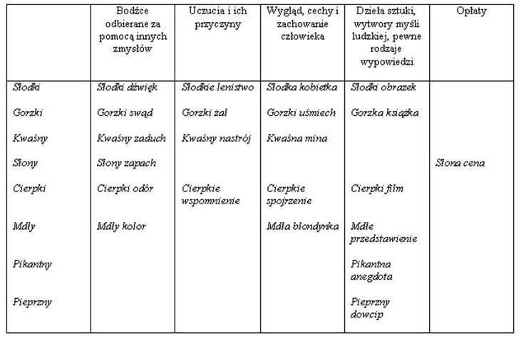 Tab. 1. Podstawowe kierunki przesunięć metaforycznych przymiotników percepcji smakowej.