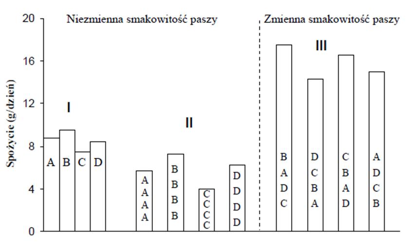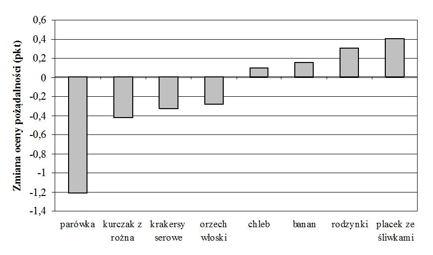 Sytość sensorycznie specyficzna – różnica między oceną hedoniczną poszczególnych produktów przed i po spożyciu do syta parówek (ocena w skali 5-punktowej: od 2 – bardzo lubię do -2 – bardzo nie lubię).