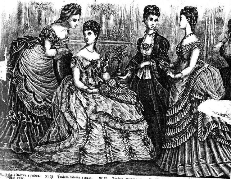 Strój kobiecy w 2.połowie XIX wieku. Rycina prasowa.